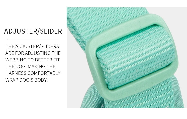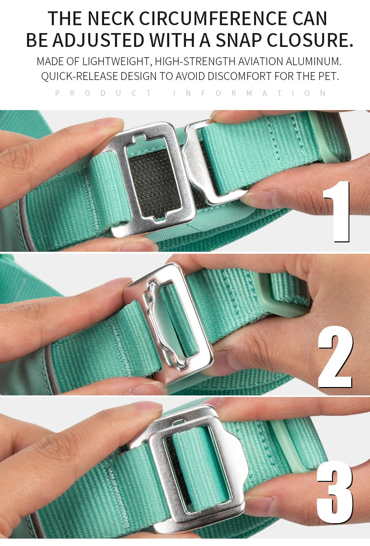 - Lightweight aviation aluminum fittings on the neck strap let you slip the harness on without pulling it over your dog's head, with a quick-release buckle for speed.